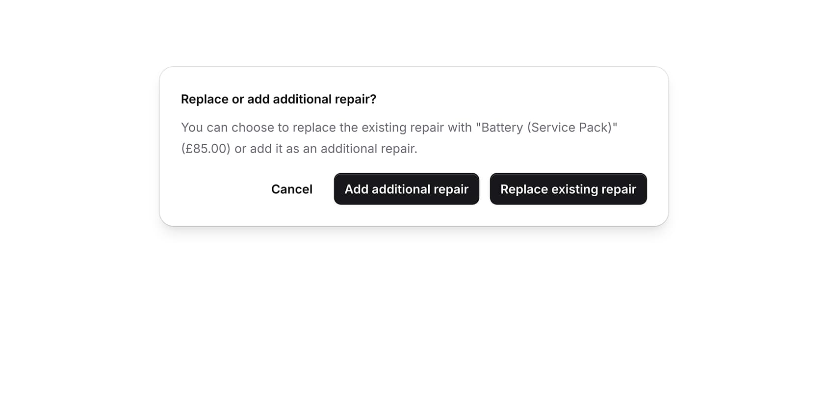 When assigning an inventory item to a repair, you can choose to update the repair and cost or add the item as an additional repair.