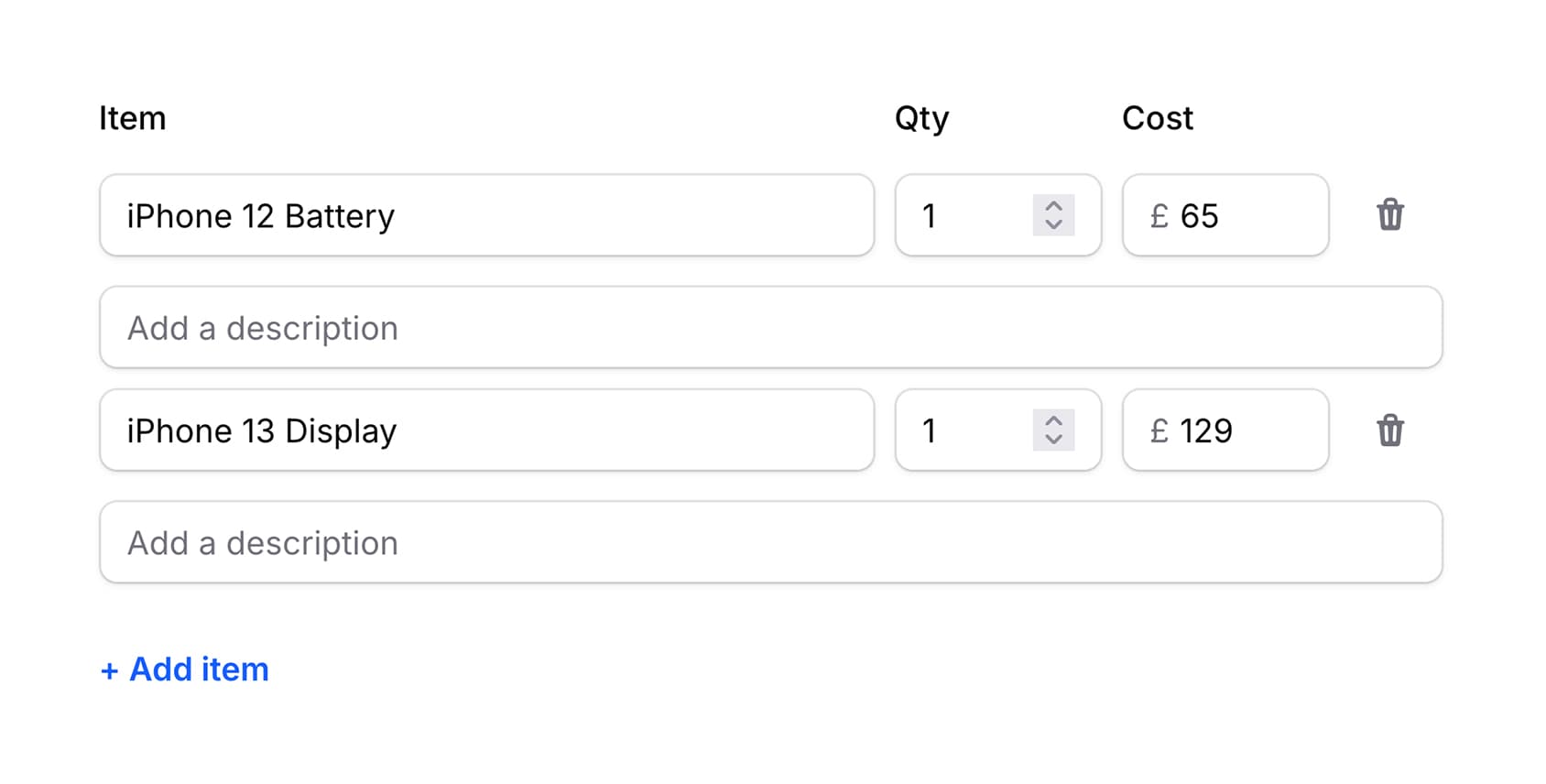 Add as many items as needed to your invoices, each with a description and price.