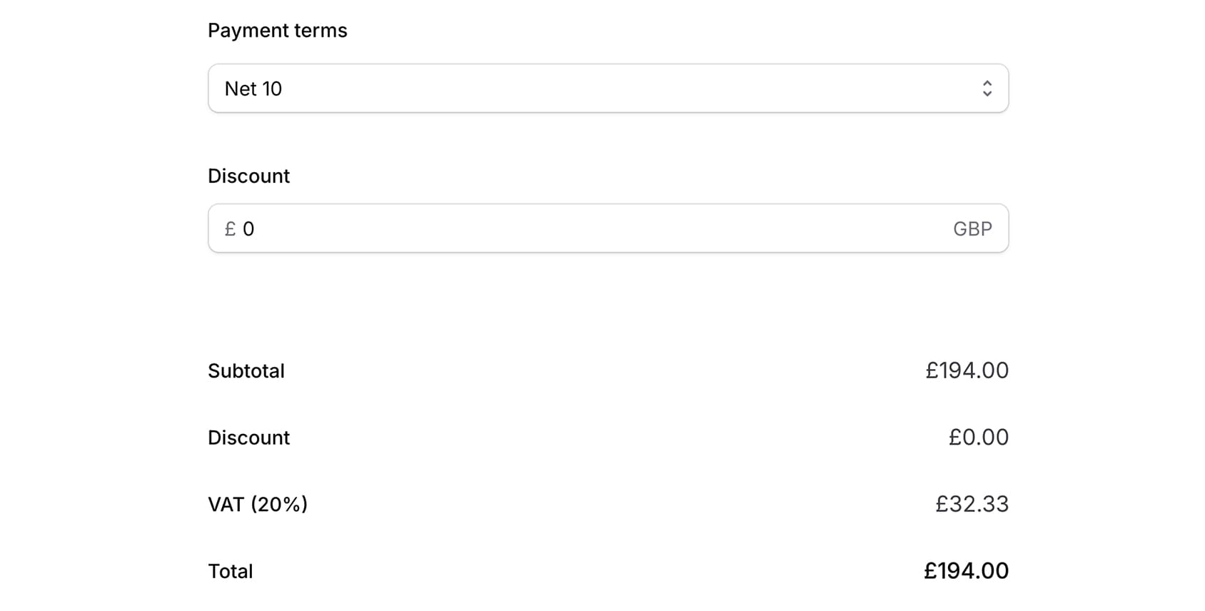 Choose payment terms such as payment in advance or net 7 - 30 days, and apply discounts for your invoices.